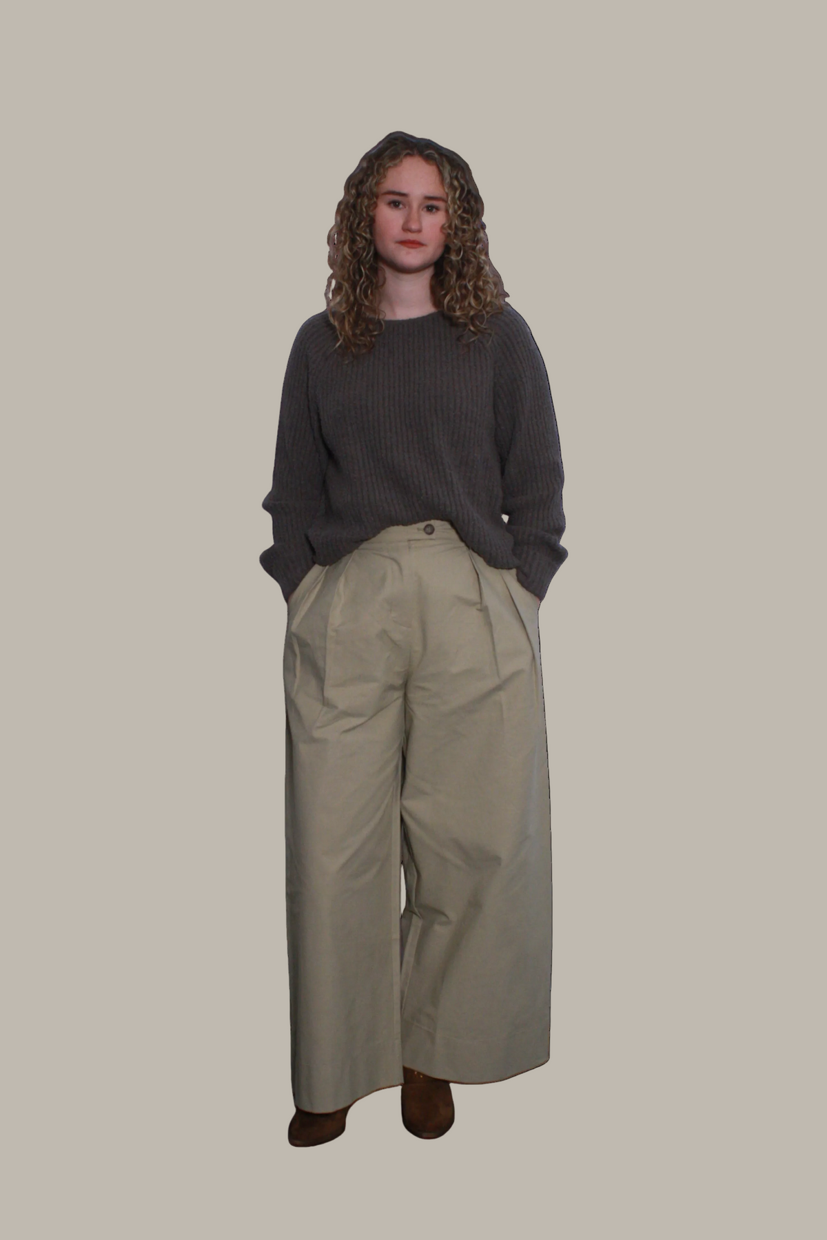 KRISSY is a wide-leg chino trouser crafted from a cotton–tencel blend, designed with soft front pleats and a clean straight-leg silhouette. Finished with a subtle asymmetrical fly button, it offers a modern, tailored look with effortless comfort.